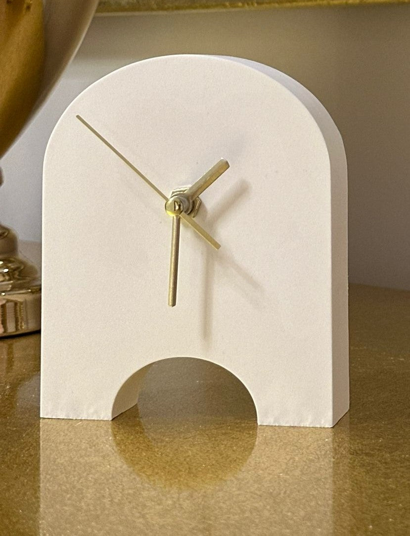 Minimal tasarımıyla dikkat çeken bu masa saati, taş tozundan el işçiliğiyle üretilmiştir. 10x12 cm ölçülerindeki kompakt formu sayesinde çalışma masasında, konsol üzerinde ya da raf dekorasyonunda zarif bir tamamlayıcı olarak yer alır.