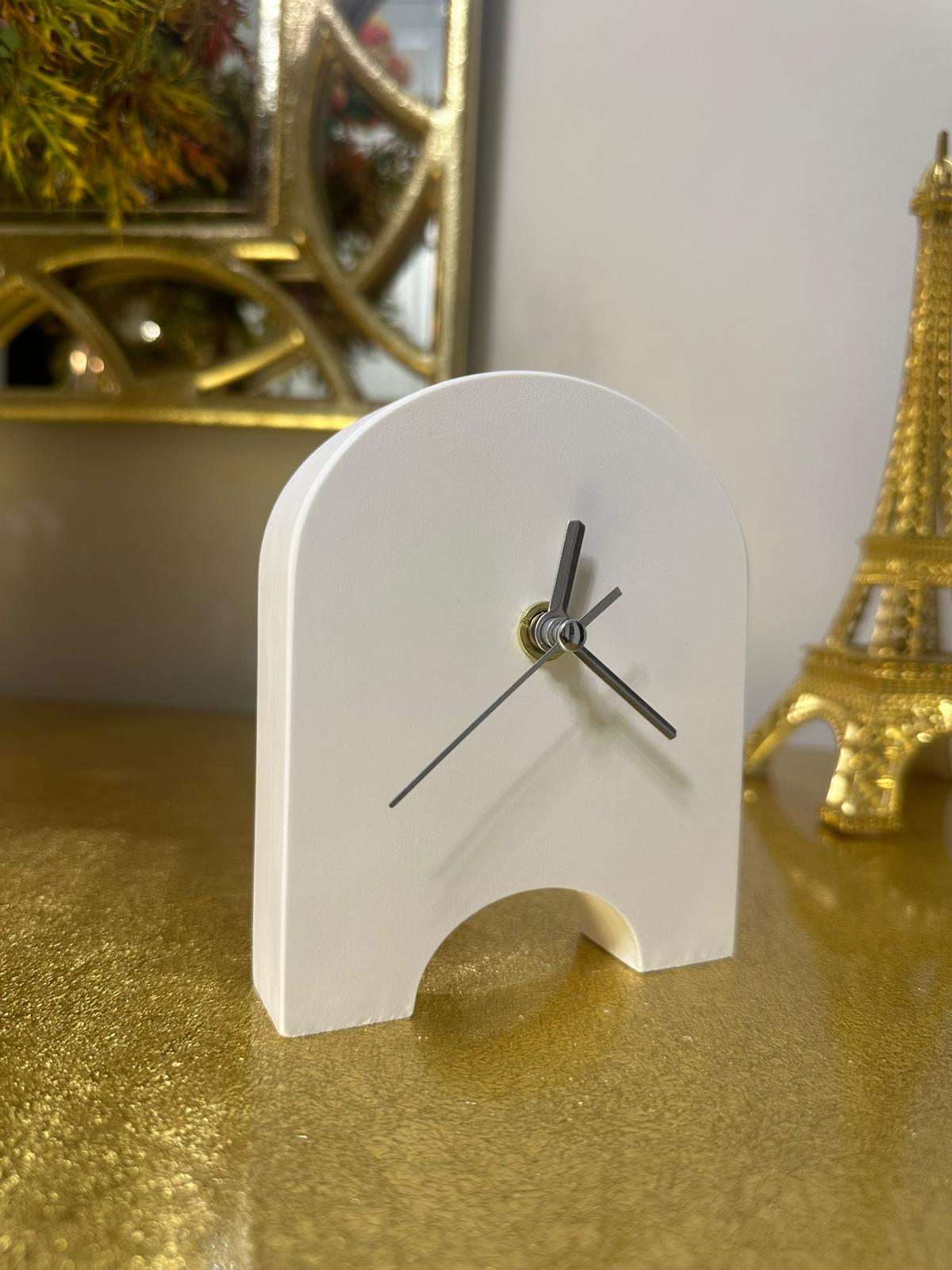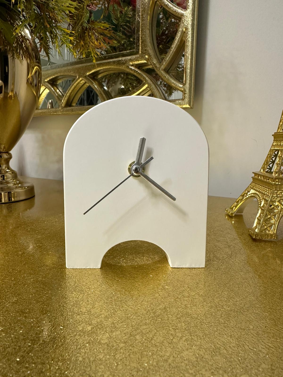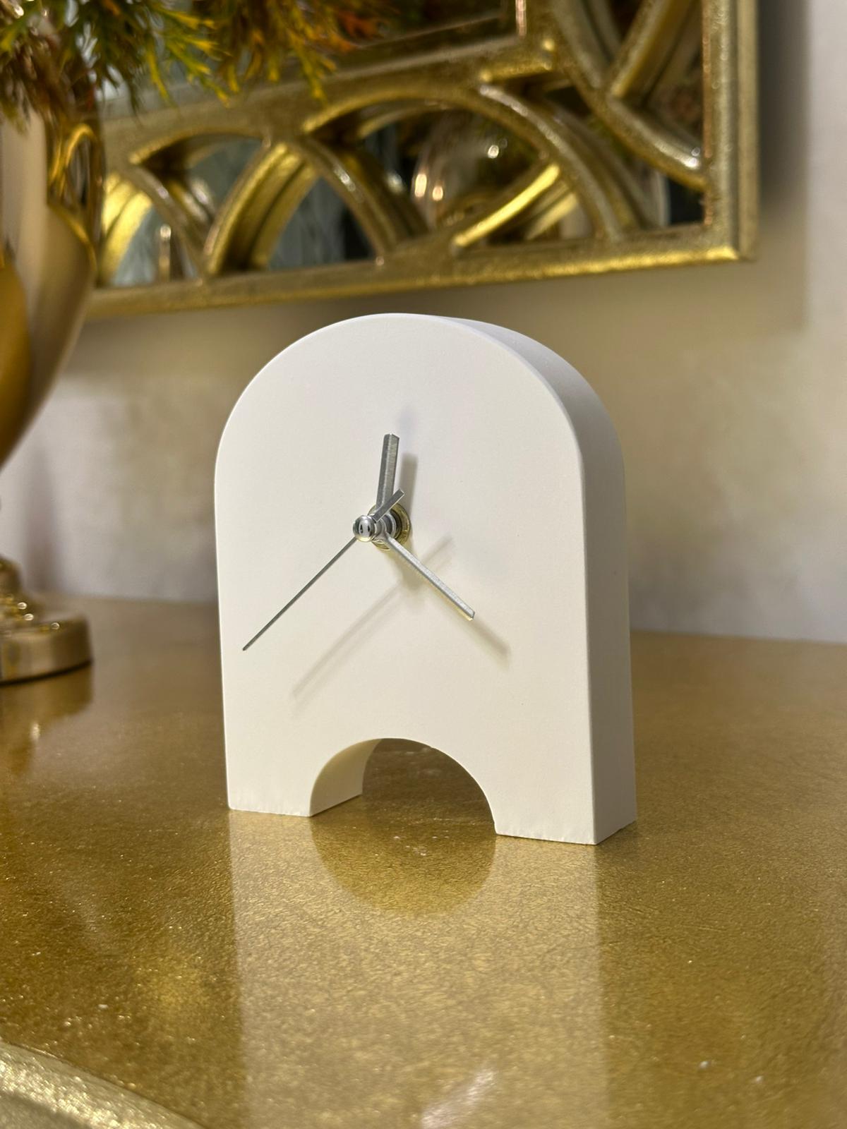 Minimal tasarımıyla dikkat çeken bu masa saati, taş tozundan el işçiliğiyle üretilmiştir. 10x12 cm ölçülerindeki kompakt formu sayesinde çalışma masasında, konsol üzerinde ya da raf dekorasyonunda zarif bir tamamlayıcı olarak yer alır.