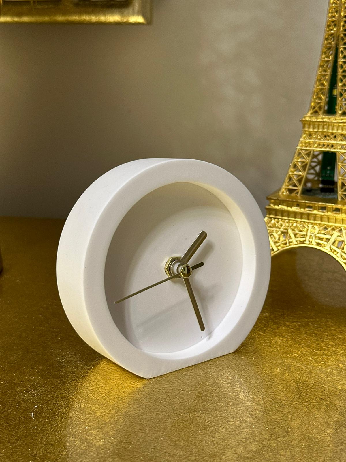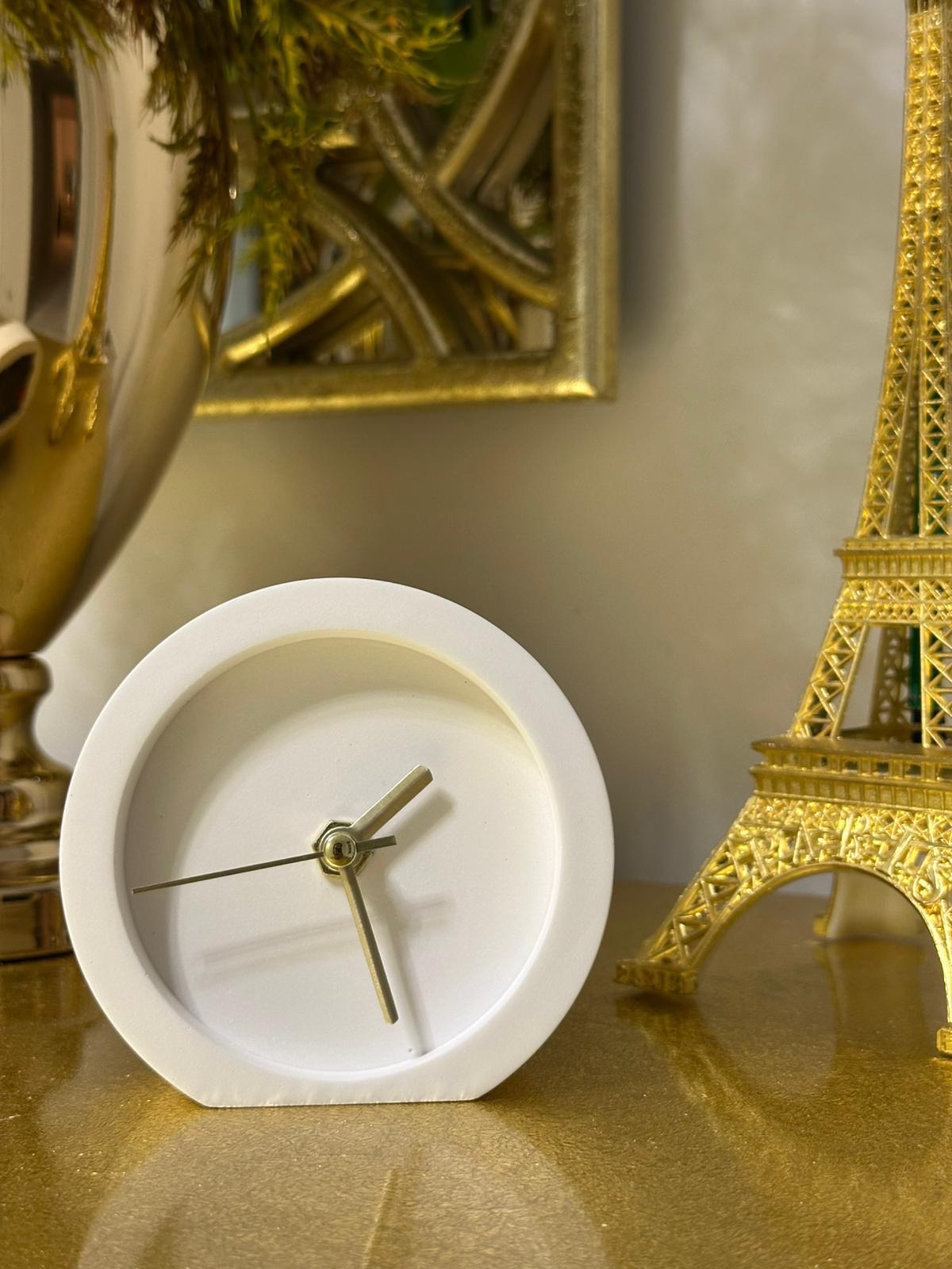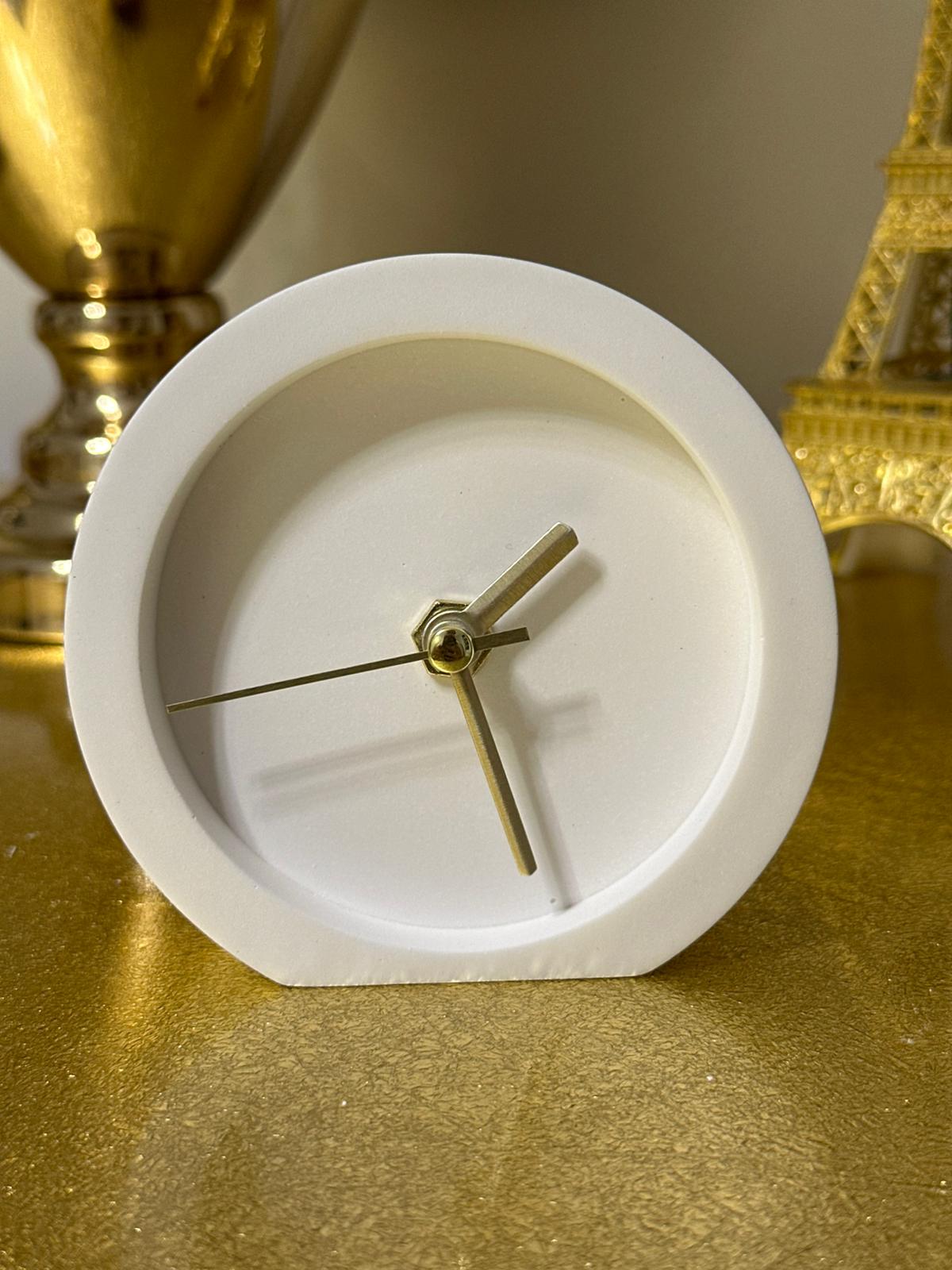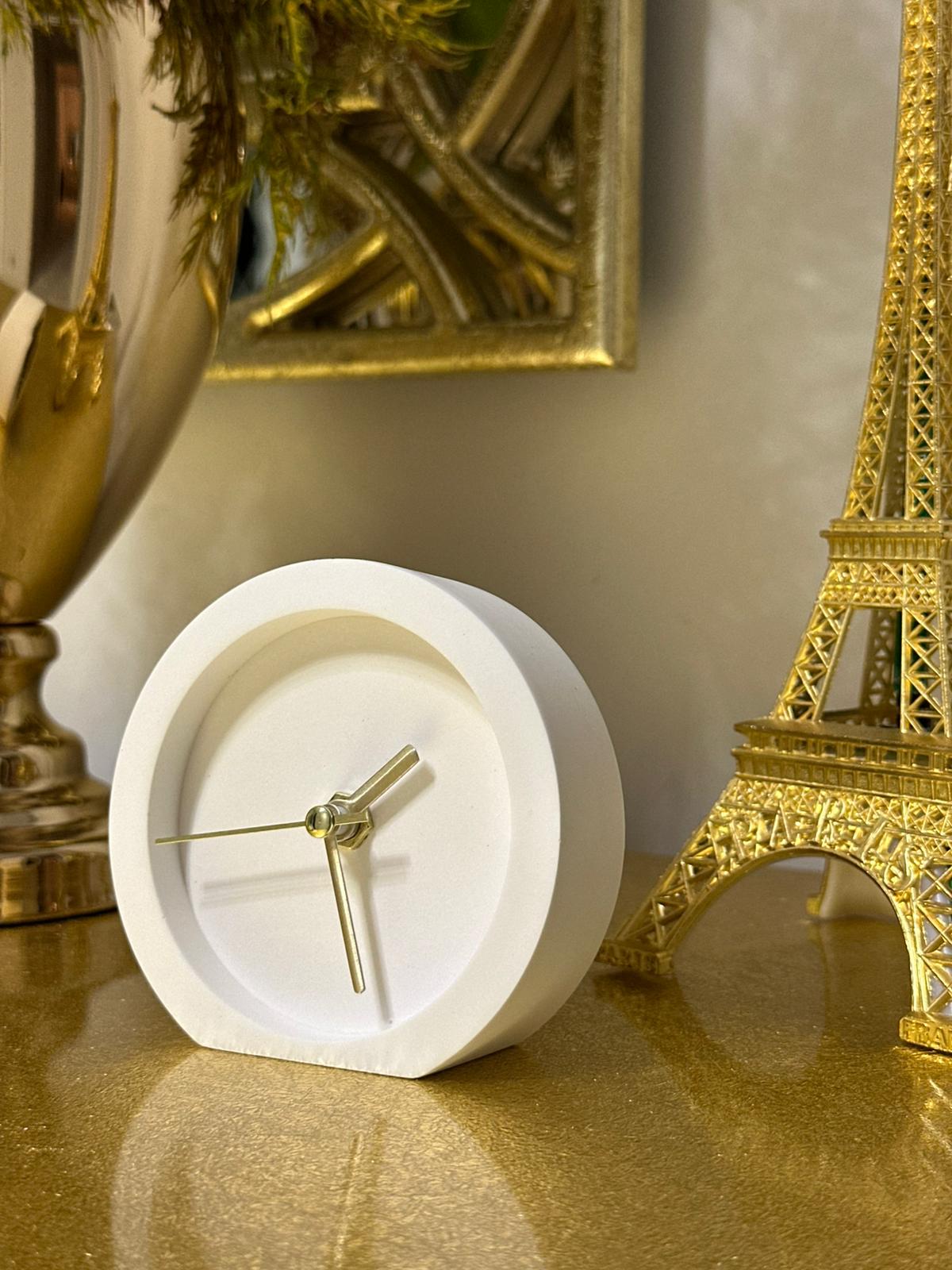 10x10 cm ölçülerindeki taş döküm masa saati, sade formu ve gold detaylarıyla modern dekorasyonun vazgeçilmez parçası. Dayanıklı yapısı ve estetik tasarımıyla çalışma alanlarına, konsollara ve raflara şık bir dokunuş kazandırır. Her bakışta zarafet ve minimalizmi bir arada sunar.