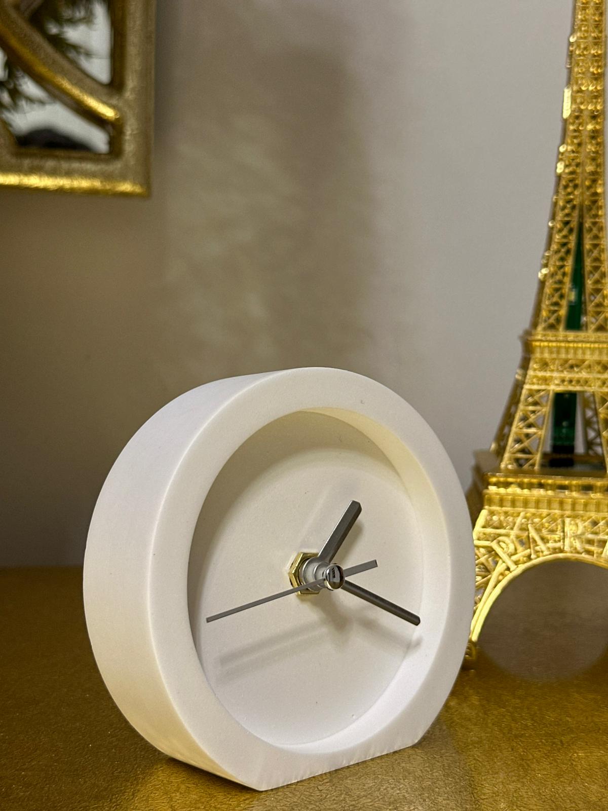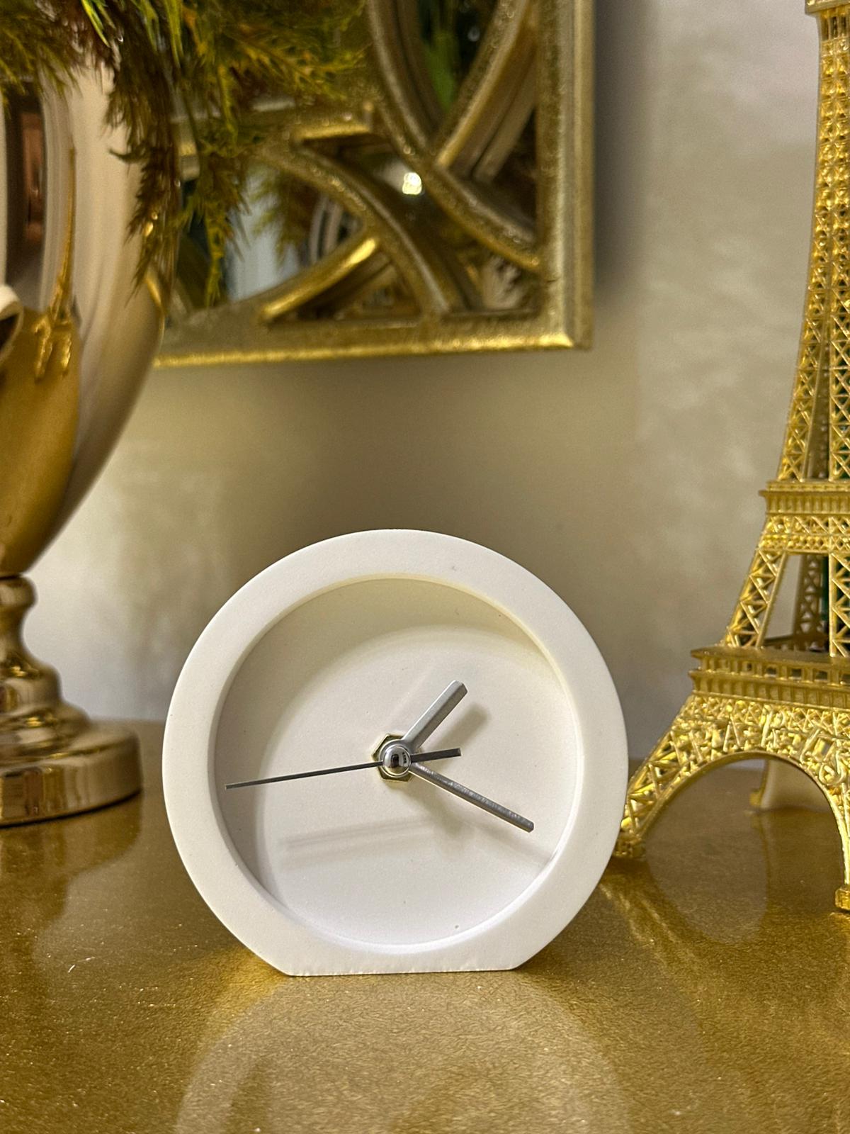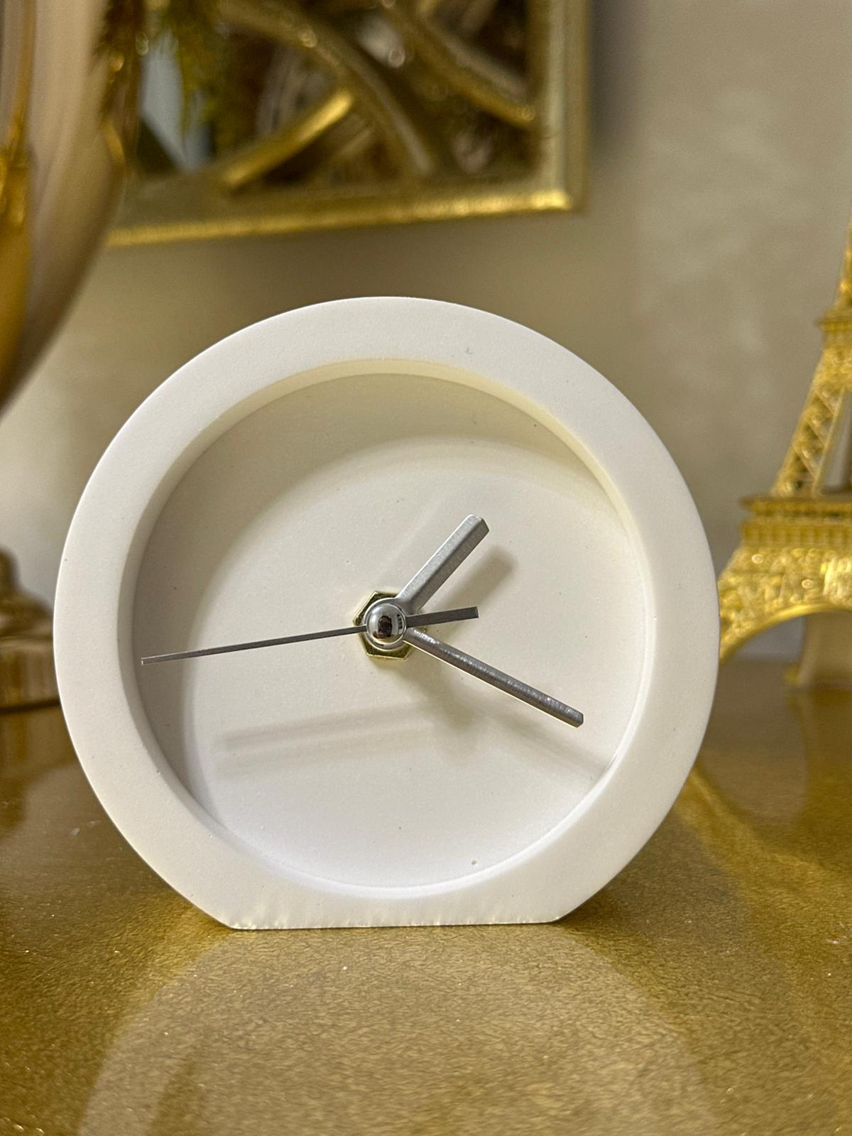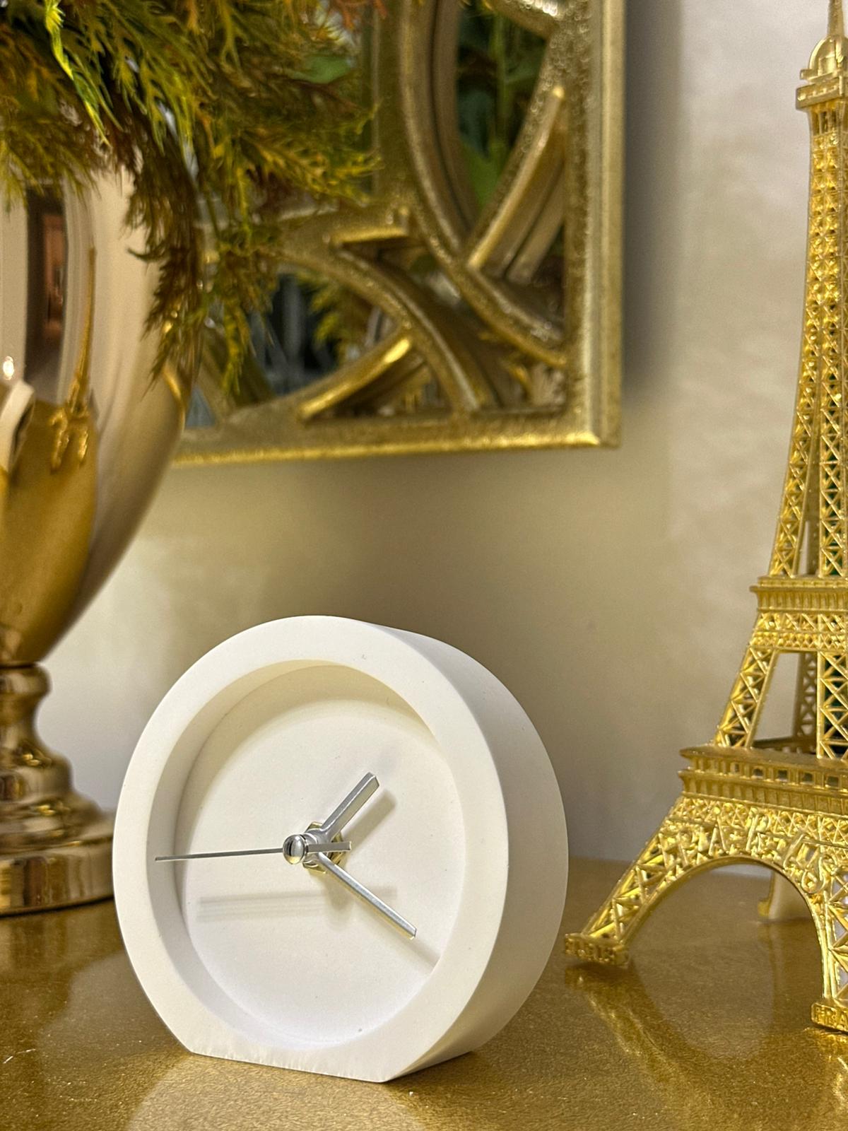10x10 cm ölçülerindeki taş döküm masa saati, sade formu ve gold detaylarıyla modern dekorasyonun vazgeçilmez parçası. Dayanıklı yapısı ve estetik tasarımıyla çalışma alanlarına, konsollara ve raflara şık bir dokunuş kazandırır. Her bakışta zarafet ve minimalizmi bir arada sunar.
